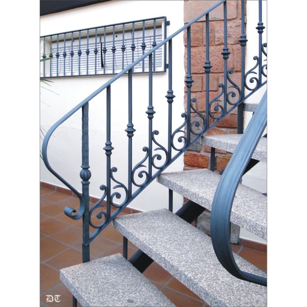 Ejemplo de baranda Nº2079, elaborada con arranques, macollas, adornos, pletinas y pasamanos de forja artística.