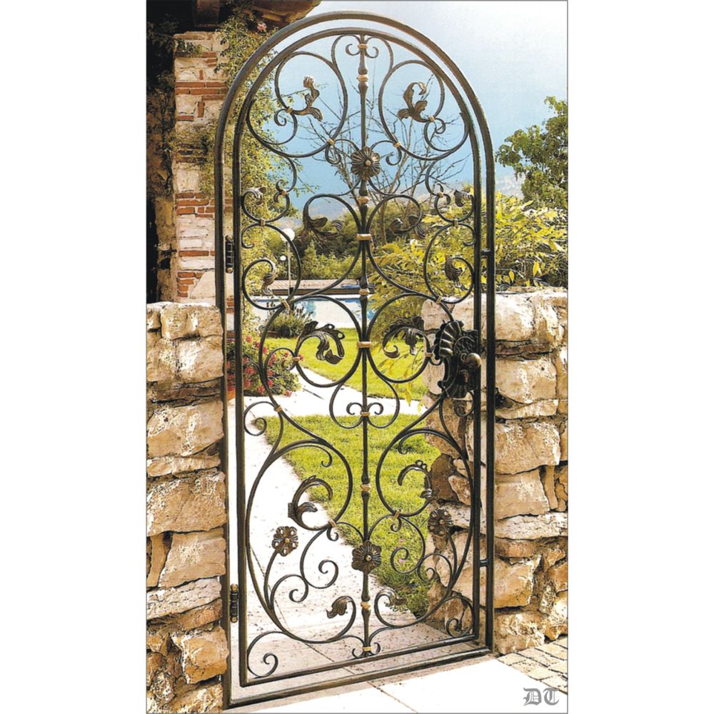 Ejemplo de cancela Nº1631, elaborada con balaustres, rosetas y adornos de forja artística.