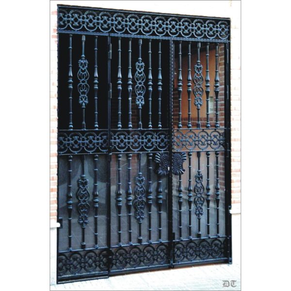 Ejemplo de cancela Nº1683, elaborada con soleras de fundición, pletinas forjadas y balaustres de hierro fundido.