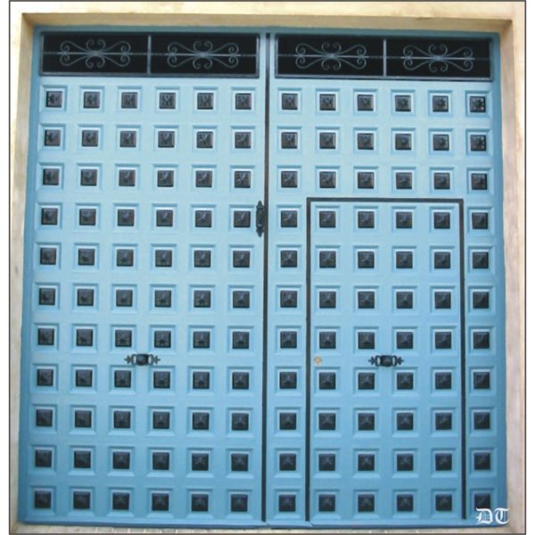 Ejemplo de portada Nº1060, elaborada con cuarterones de chapa, balaustres de forja, pomos de hierro forjado y llamador de aluminio.