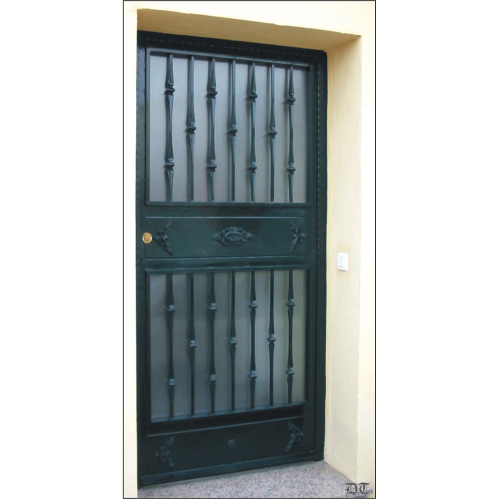 Ejemplo de puerta Nº1008, fabricada con balaustres de hierro forjado, rosetas de hierro fundido y tapajuntas de forja.