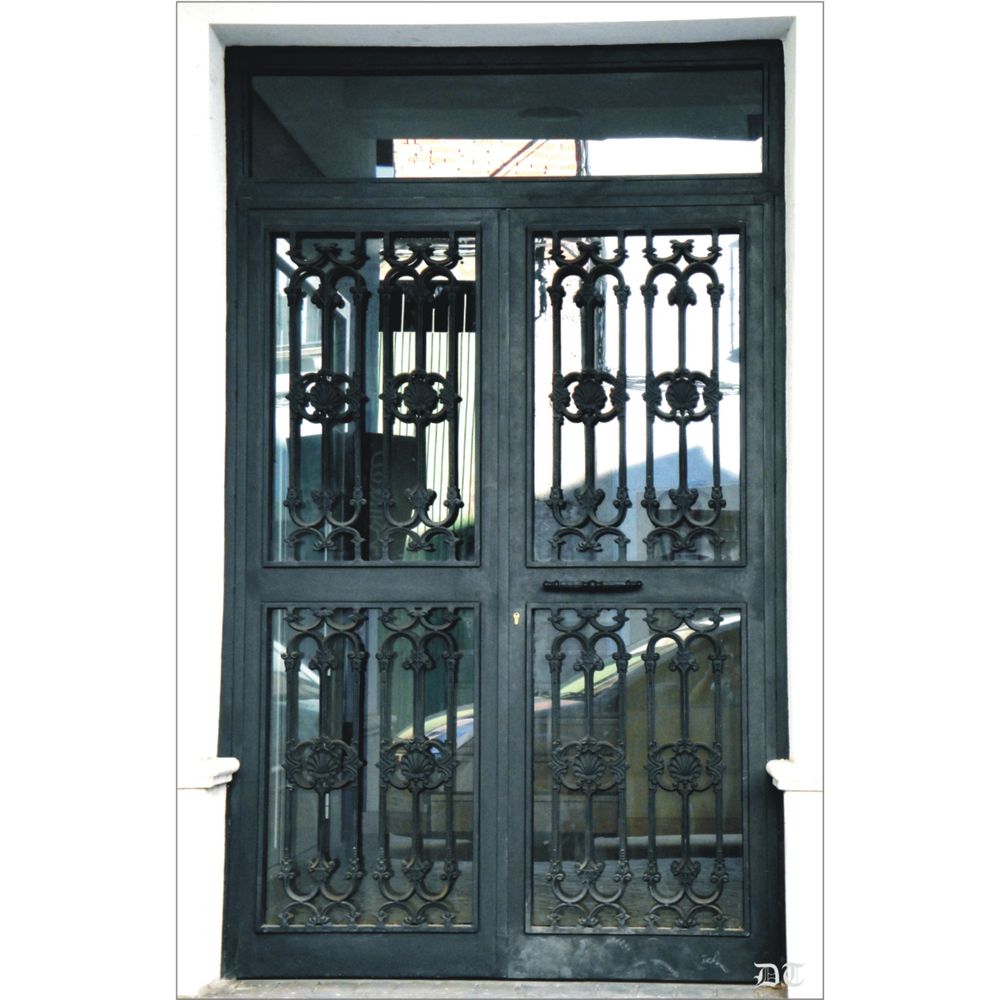Ejemplo de puerta Nº1020, elaborada con balaustres de fundición artística y tirador de forja.