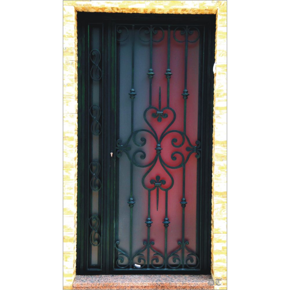 Ejemplo de puerta Nº1037, elaborada con adornos, macollas y soleras de forja artística.