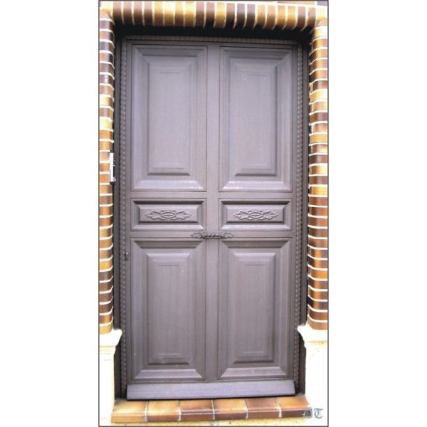 Ejemplo de puerta Nº1052, elaborada con cuarterones de chapa, pletinas de forja y tirador de hierro forjado.