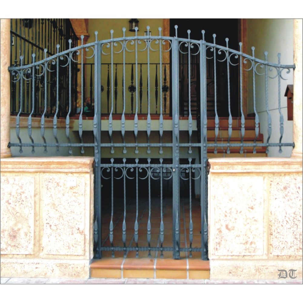 Ejemplo verja de forja Nº5016, elaborada con adornos, pletinas y barrotes especiales de hierro forjado.