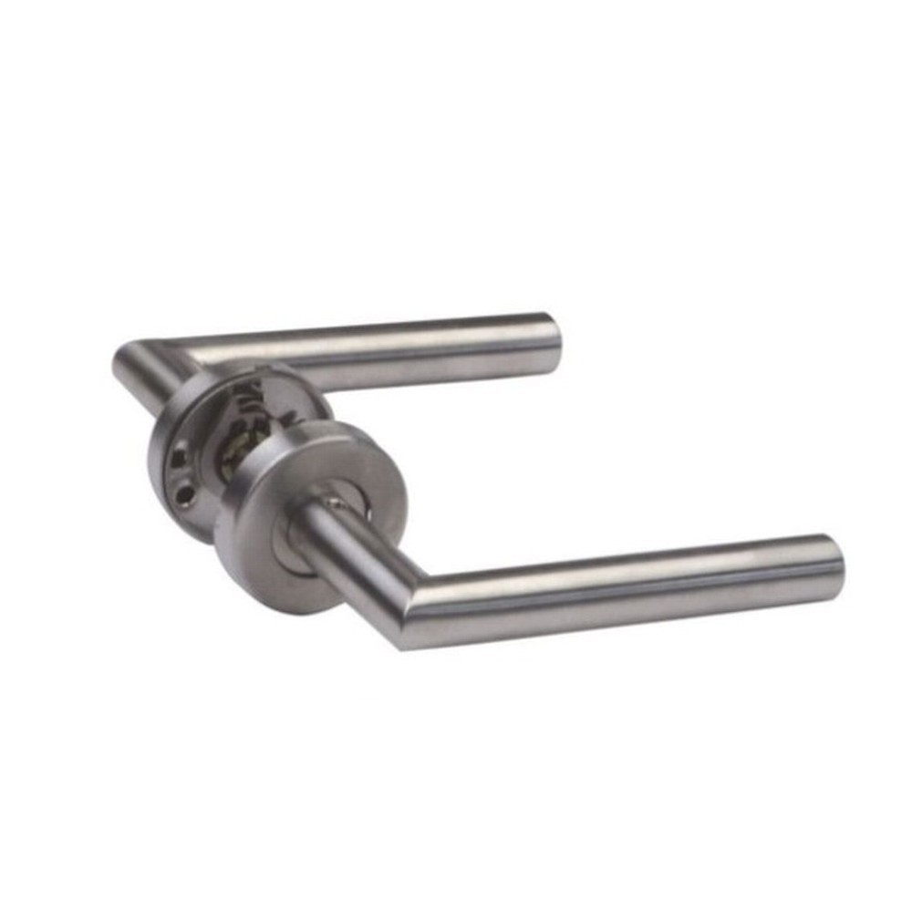 Este juego de manivela está fabricado en acero inoxidable AISI304 con acabado satinado esmerillado, mide 136x70mm y la placa es de redondo de ●52mm.