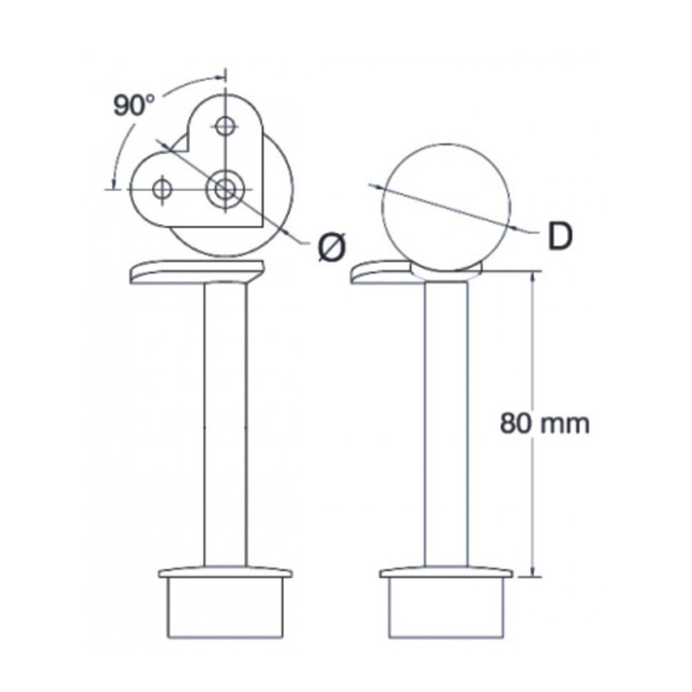 Este soporte para pasamanos de inox mide 80mm de alto, está disponible para encajarlo en tubo o poste vertical Ø42,4×2,6mm y arriba un pasamanos o tubo Ø42,4mm a 90º. Consultar otras medidas.