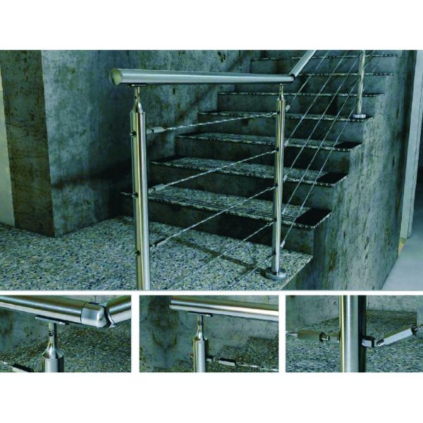 Los herrajes y piezas para esta barandilla con cable de inox están disponibles en acero inoxidable satinado esmerillado y acero inoxidable pulido espejo.
