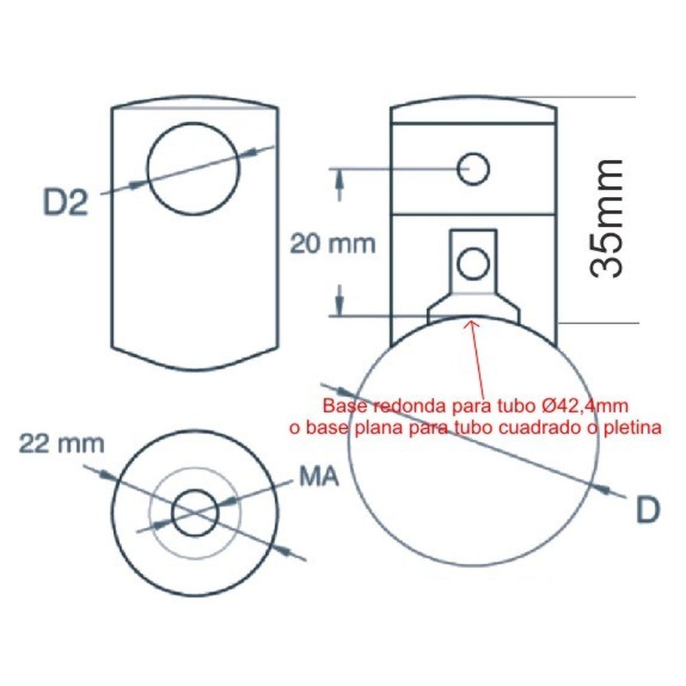 Agujero ciego a mano izquierda para Ø12mm · Base para acoplar en tubo Ø42,4mm