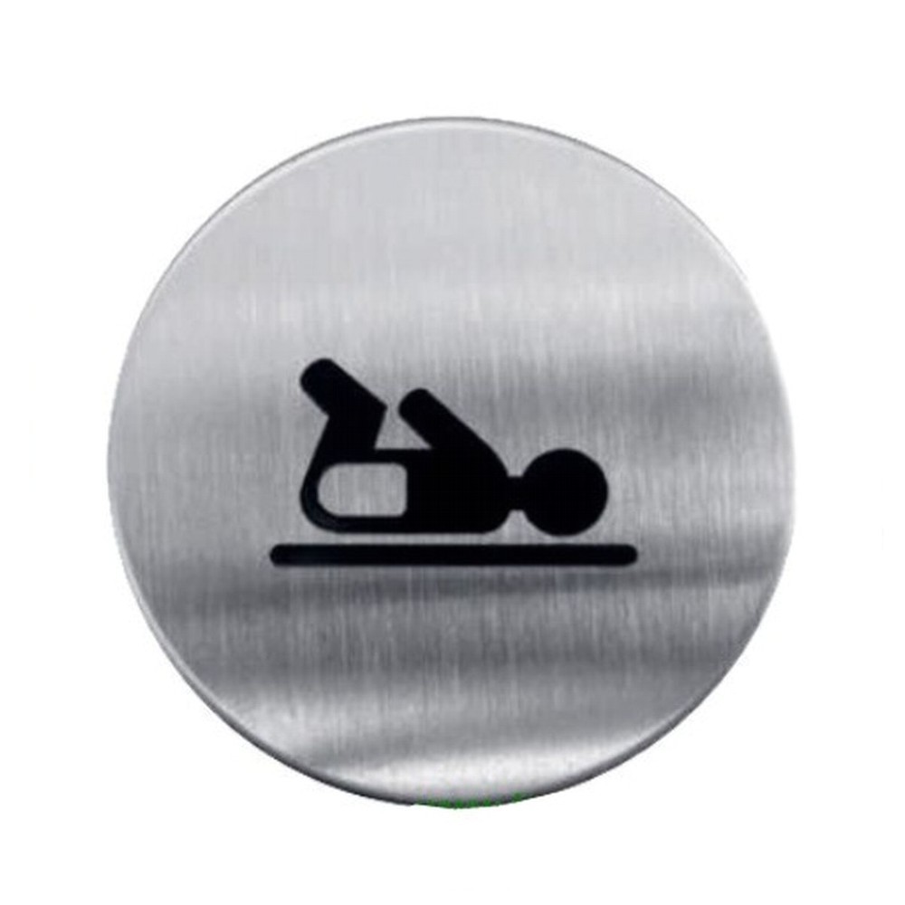 Letrero círcular de acero inox con silueta de bebé para indicación de habitaciones, aseos o lavabos con cambiador o de lactancia, referencia 954-INOX.