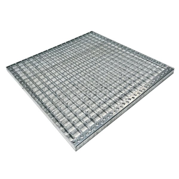Meseta cuadrada galvanizada para escaleras, fabricada en entramado metálico de pletina + varilla (tramex) con un borde antideslizante, referencia 301-CHP y disponible de estas medidas:
