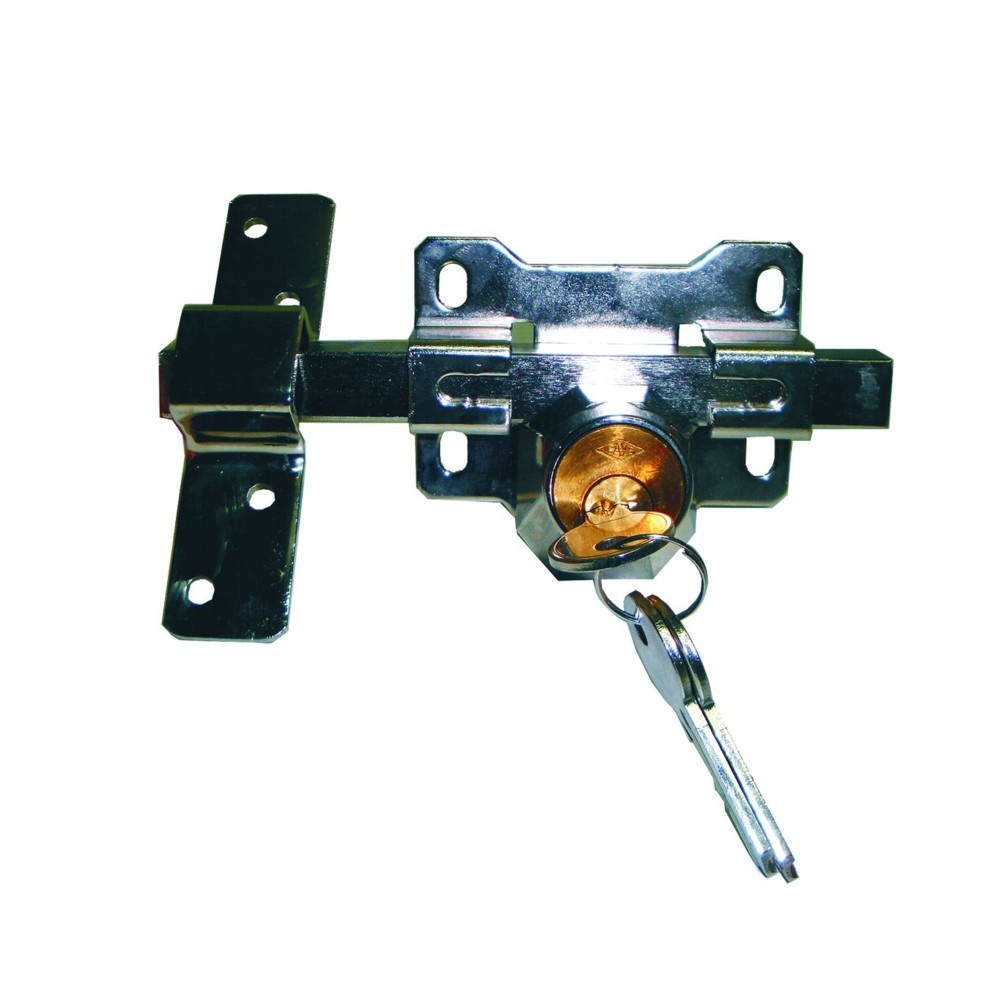 Cerrojo niquelado referencia 1-CJH de 160x75mm con placa de 85x75mm.