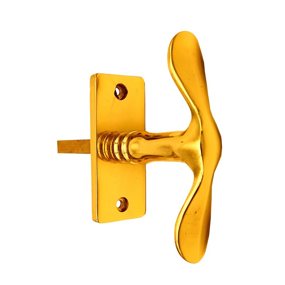 Manilla de latón en forma de T para acoplar en puertas y cancelas con poco espacio, evitando con ello el roce con el tapajuntas, referencia 62-PVL de 90mm y con placa de 70x30mm.